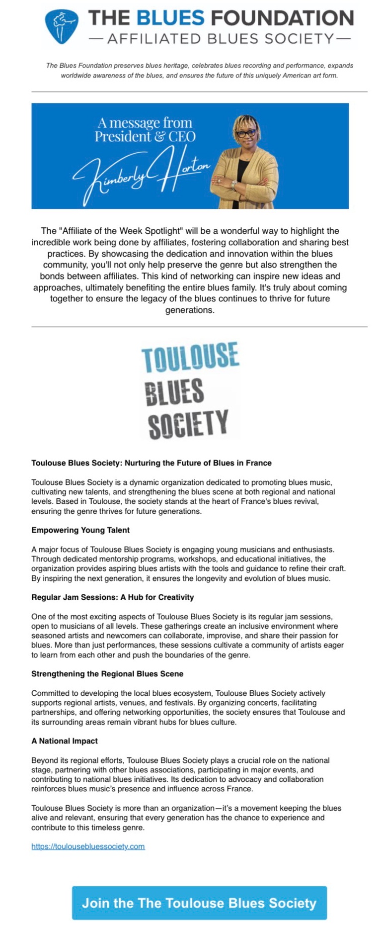 Nous sommes heureux de partager une excellente nouvelle : Toulouse Blues Society vient d’être mise à l’honneur par la Blues Foundation dans une newsletter spéciale adressée à l’ensemble de ses membres. Cette reconnaissance internationale souligne le travail remarquable mené à Toulouse et dans toute l’Occitanie pour faire vivre, rayonner et transmettre la culture blues.